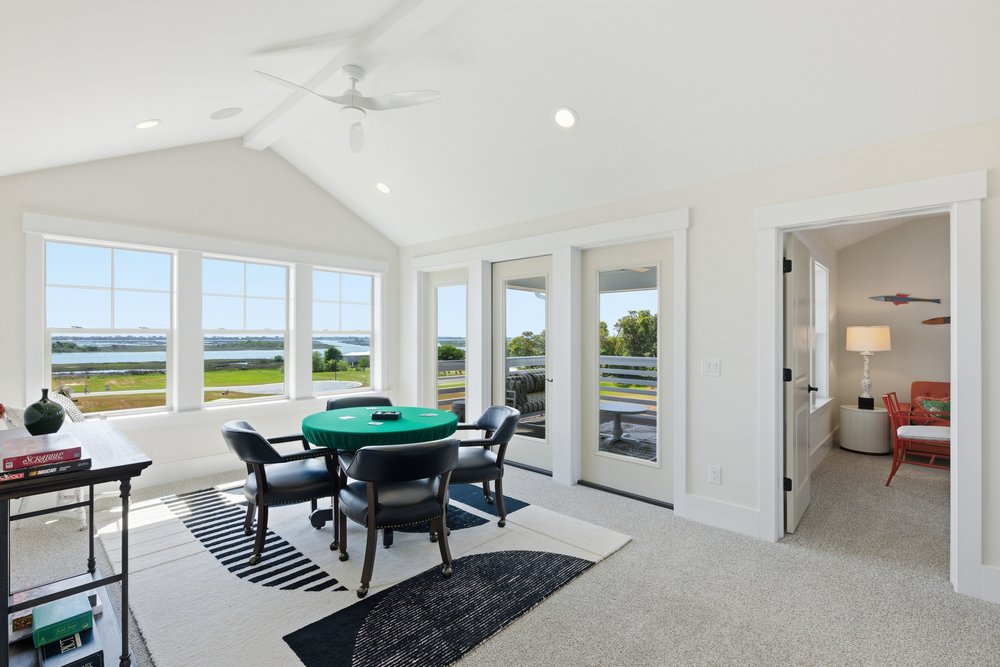 Each of the Port Royal Sound’s bedrooms has a connected en suite. The largest, with a long dual vanity and cavernous zero-entry shower, belongs to the primary suite. Awash in natural light from wide bay windows, this owner’s suite exudes elegance, with a seating area and a large walk-in closet. On the floor above, one spacious bedroom has its own full bath, while two more bedrooms share a large Jack-and-Jill en suite. The bedrooms’ tall windows and discreet pocket doors continue the graceful theme.